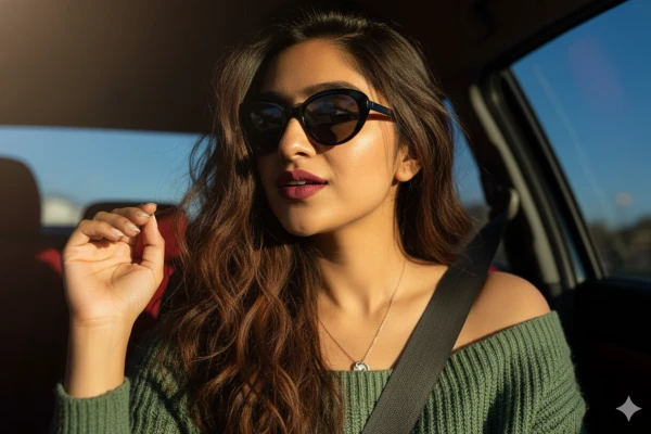 Golden Hour Cinematic Portrait Prompt: Using my original face 100% create A stylish woman is captured in a close-up, slightly angled shot inside what appears to be a car, with sunlight streaming in from the left, creating strong highlights on her hair and skin. She has long, wavy, rich brown hair that cascades over her shoulders, appearing a bit windswept. She is wearing dark, oval-shaped sunglasses. 1/2 Her makeup features a prominent, matte, deep rose or reddish-brown lipstick, and her skin appears smooth with subtle contouring, especially visible on her cheekbones and jawline, which are enhanced by the lighting. She is wearing a cozy gage green top, revealing her shoulders and collarbone. A delicate, possibly silver, necklace with a small pendant is visible. Her right hand is raised, with fingers slightly spread and relaxed, catching some of the golden light. The car interior is dark, with hints of a red seat and a seatbelt visible. A glimpse of the bright blue sky can be seen through the car window on the right"