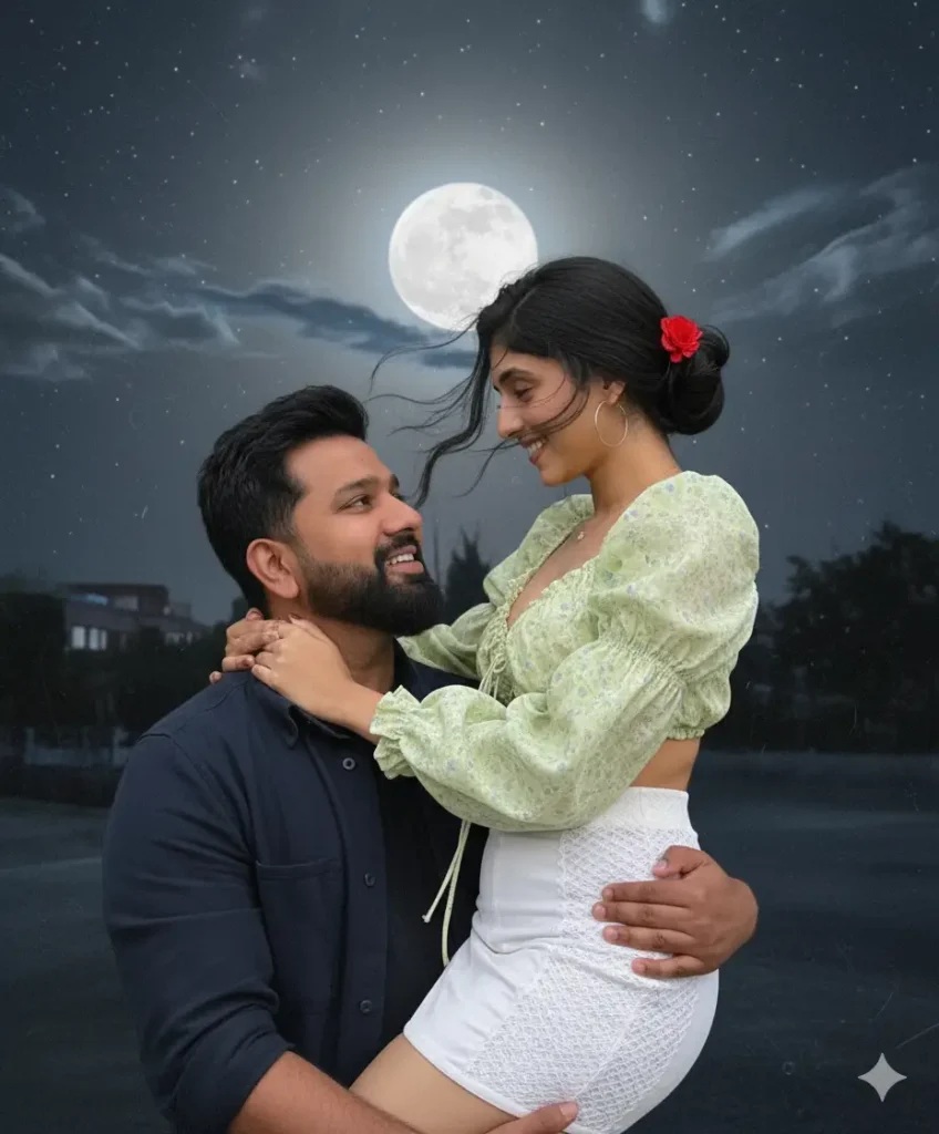 Prompt 4: Make a realistic couple picture by making sure the boy and girl are together, and the boy is holding the girl in his arms, and our dresses will not be changed, (use boy and girl face with accurate 100%) Girl wear a small diamond mangalsutra. It must feel like 90's movie dark black hair with a small red color flower tucked into her bun and romanticizing windy environment. The background is moonlit beautiful.
