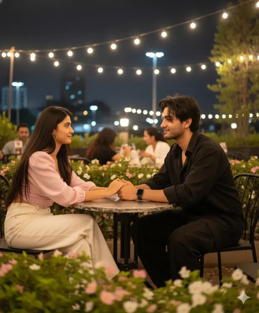 Prompt 1: A 18 year old young man (same face as reference) with messy hair over the eye sits at an outdoor café at night, wearing a loose black shirt, black baggy cargos, and a black smartwatch. His naturally styled dark hair frames his face. Around him, lush green plants with pink and white flowers create a cozy setting. Warm string lights and café lamps glow softly in the background. Across from himsitsayoung woman with long darkhair in a pastel-toned casual outfit.