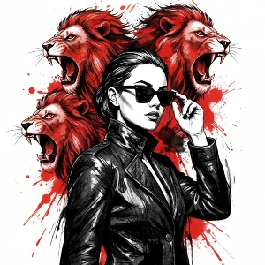 Illustrated Lion Portrait Prompt: A stylized illustrated portrait of a man (use same face as uploaded in refference image, keep his real face unchanged) shown from a three-quarter view from mid-torso upward, body turned slightly to the right, with one hand reaching up to adjust his dark rectangular sunglasses. He looks directly at the viewer with an intense, confident expression. He wears the same dark, high-collared jacket with heavy, rough ink-style texture. The artwork uses bold black sketch strokes for the figure and vivid red paint strokes forming a massive, roaring 3 head lions standing behind him. High-contrast shading with deep blacks, pure ink illustration style. Camera angle is frontal at eye level, tight frame around the upper torso. Clean white background with dynamic black and red ink textures. ar3:4