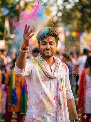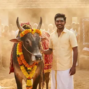 Pongal Photo Prompt with OX: Create an image of a young man standing proudly beside a decorated bull, showcasing the essence of Jallikattu, a traditional Tamil festival. The man is dressed in a light yellow shirt and white dhoti, adorned with a sacred mark (vibhuti) on his forehead, exuding a sense of pride and strength. The bull, which is a symbol of rural tradition, is beautifully decorated with a garland of marigold flowers and a red cloth, adding vibrancy to the scene. The background should feature rustic elements, such as earthen pots and traditional Tamil wall art, enhancing the cultural richness of the scene. The air should be filled with energy, as the bull is ready for the festival, while a pot of milk overflows, symbolizing prosperity. The lighting should be warm, with the golden glow of early morning or evening, emphasizing the rural, traditional atmosphere.