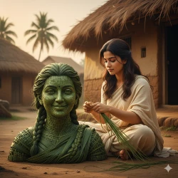 Banana Leaves Self Making Sculpture Prompt: A photorealistic documentary-style image of the uploaded image acting as a traditional artisan in a rural Indian village. The person is sitting on the ground, hand-weaving a life-sized sculpture that is an exact replica of their own head and torso. ABSOLUTE RULE: The sculpture must be made EXCLUSIVELY from fresh green palm leaves and organic plant fibers. Every detail of the face, hair, and clothing on the sculpture must be formed by intricate weaving, braiding, and knotting of green leaves. No artificial colors, plastics, or factory finishes. The scene is set outside a mud hut during golden hour, with soft sunlight hitting the textures of the leaves. High-detail leaf veins, fibers, and handmade imperfections. Shallow depth of field, 9:16 aspect ratio.