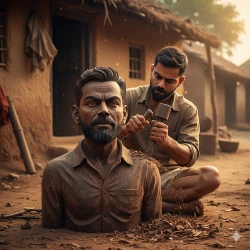 Wooden Self Made Sculpture Prompt: A hyper-realistic documentary-style portrait of uploaded image acting as a master woodworker in a sunlit, dusty workshop. They are sitting on a low stool, meticulously carving a life-sized sculpture out of a single, massive block of dark teak wood. The sculpture is a perfect, identical replica of their own head and torso. The person is holding a traditional mallet and chisel, mid-strike on the sculpture's shoulder. Fine wood shavings and sawdust are scattered on the floor and visible in the air where the light hits. The wood grain on the sculpture’s 'skin' and 'hair' is incredibly detailed. Cinematic golden hour lighting, 9:16 aspect ratio, shallow depth of field with a blurred rustic background.